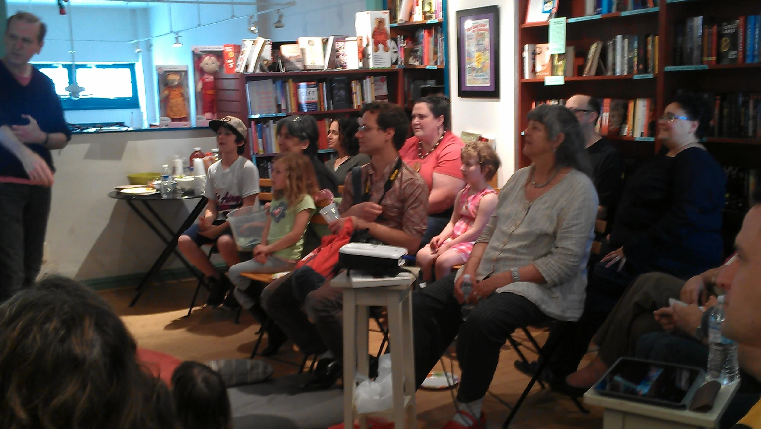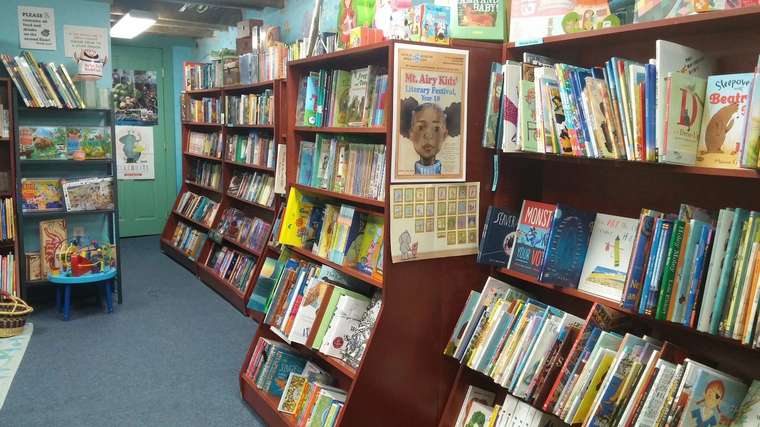 At the back of our first floor, down a few steps, you'll find our kids' section, with: picture books, board books, chapter books, early readers, children's poetry, comics and graphic works, nonfiction including religion, myth, history, biography, science, and nature, games, activities, toys to buy AND toys to play with