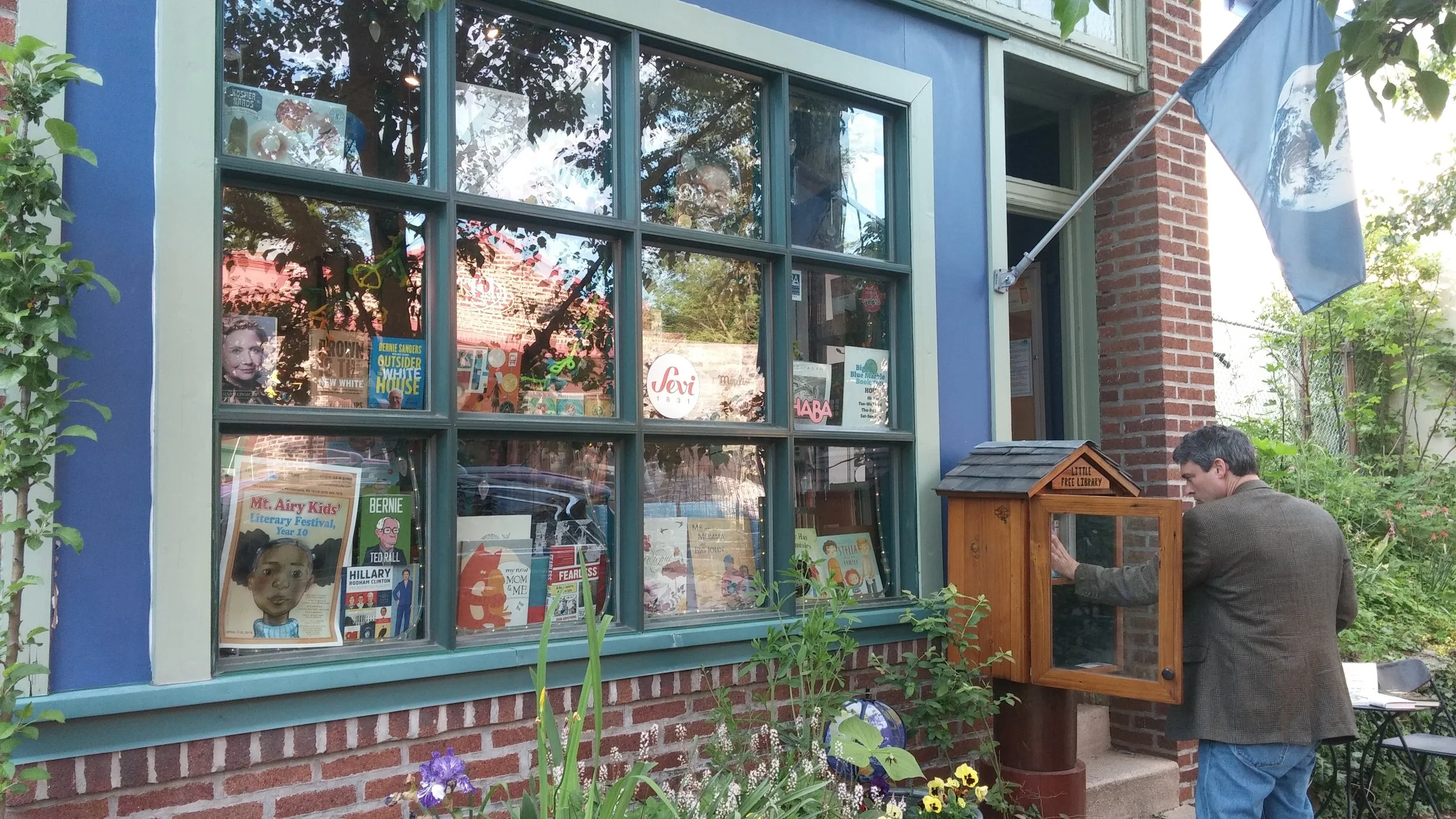 Welcome to our store! We have a beautiful Little Free Library, so you can start browsing for books before you come in. If the Earth flag is out, we're open. In the summer, check our sidewalk sale table for great deals.